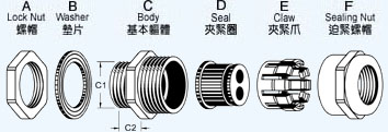 A.C.F部分以锌合金镀镍制成,E部分以UL认可之尼龙PA66制成(防火等级UL94V-2),B及D部分采用EPDM耐候橡胶制成。